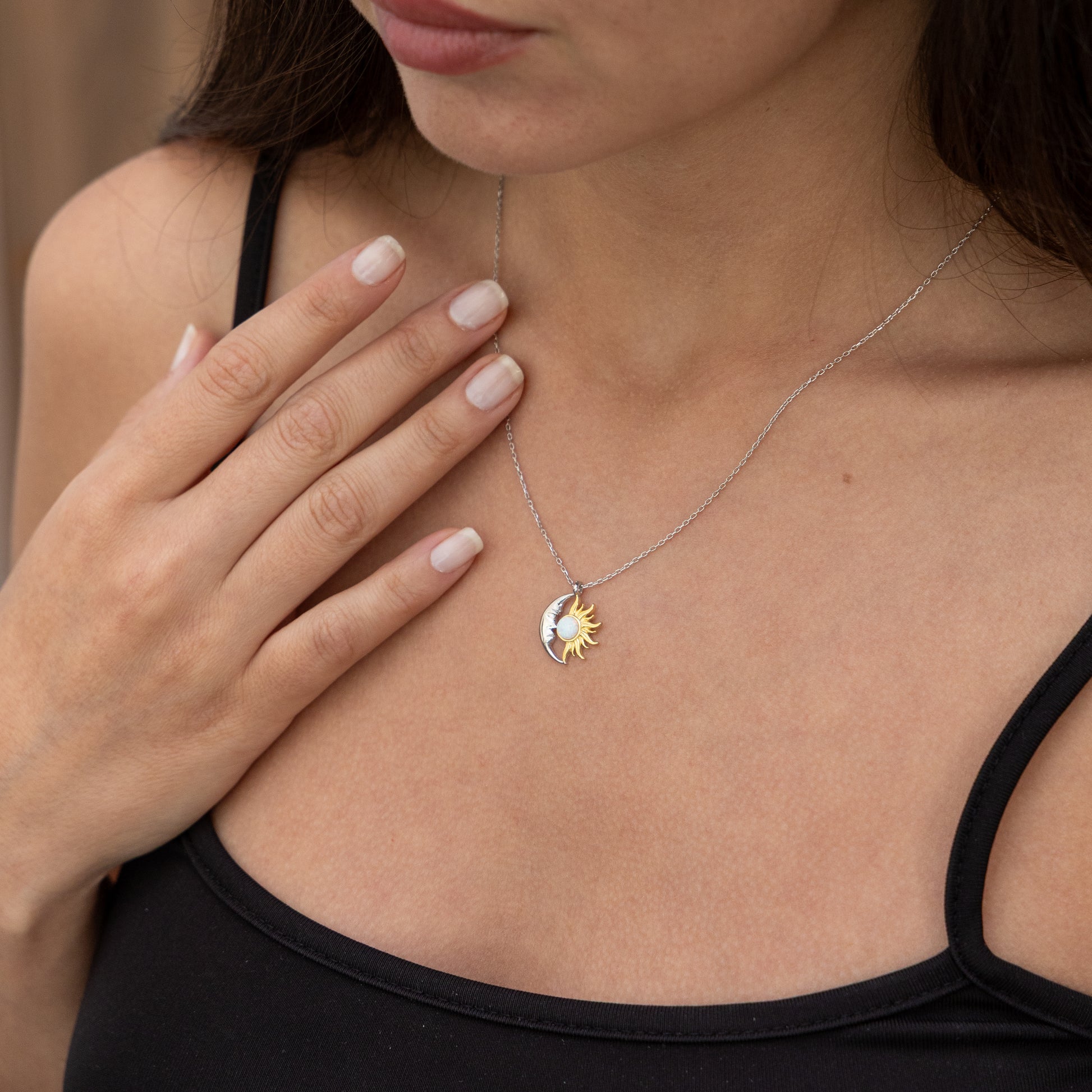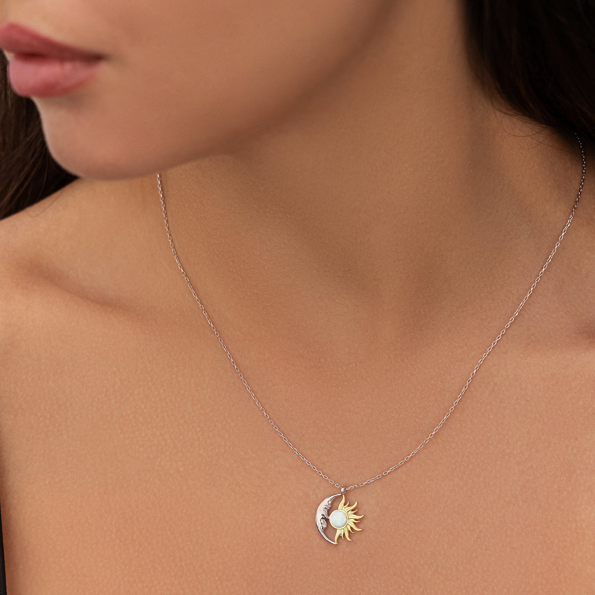 Bu Ay ve Güneş kolye, gece ve gündüzün büyüsünü üzerinde taşımak isteyenler için tasarlandı. Zarif ay detayı ve altın kaplama güneş figürü, ortasındaki parlayan opal taş ile bütünleşir. 925 ayar gümüşten üretilmiş olup hem gümüş zincir hem de altın zincir seçeneği sunar. Günlük şıklığınıza anlam katar veya özel günlerde mükemmel bir hediye olur.