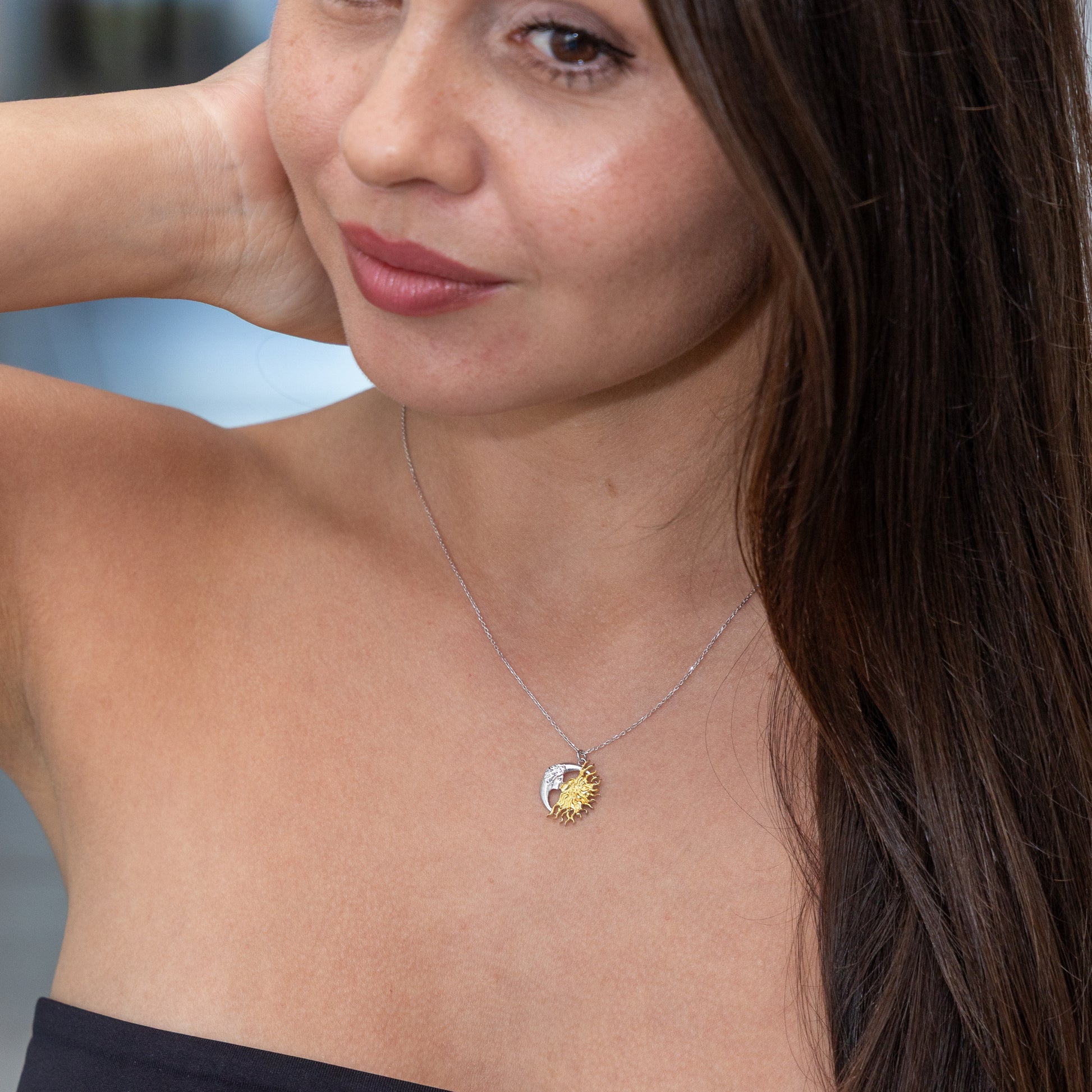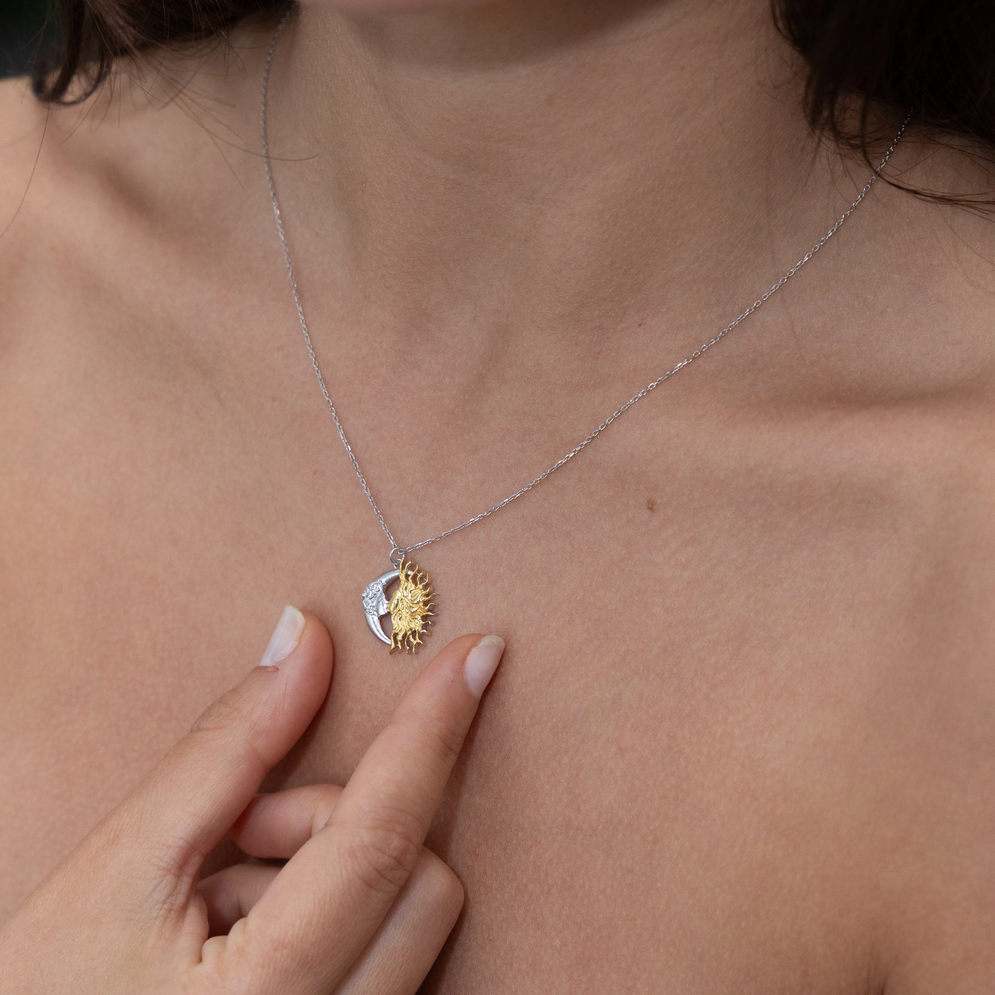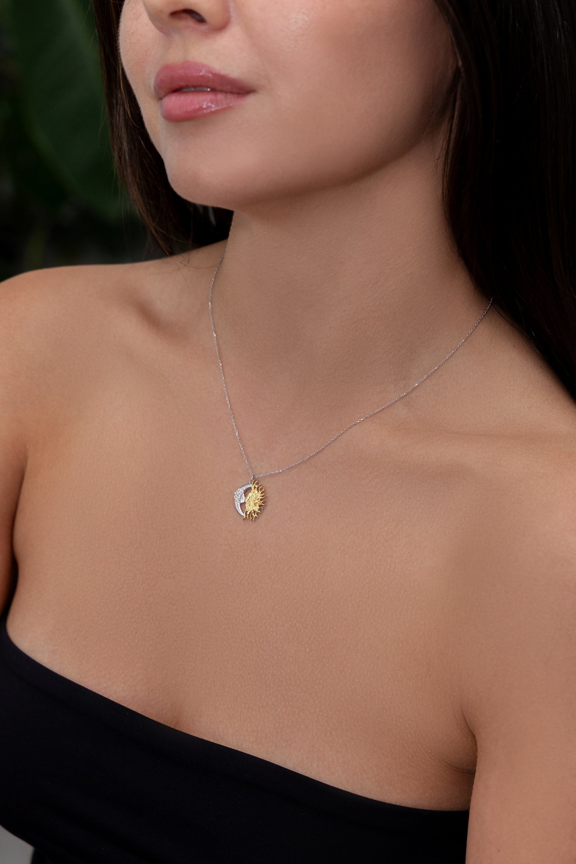 Gece ve gündüzün uyumunu simgeleyen bu Ay ve Güneş kolye, anlamlı bir tasarım arayanlar için ideal bir parça. 925 ayar gümüşten üretilmiş ve detaylı güneş figürü altın kaplama ile öne çıkarılmıştır. Hem gümüş zincir hem de altın zincir seçenekleriyle sunulur. Minimal ve zarif tasarımı sayesinde günlük kombinlerinize kolayca uyum sağlar.
