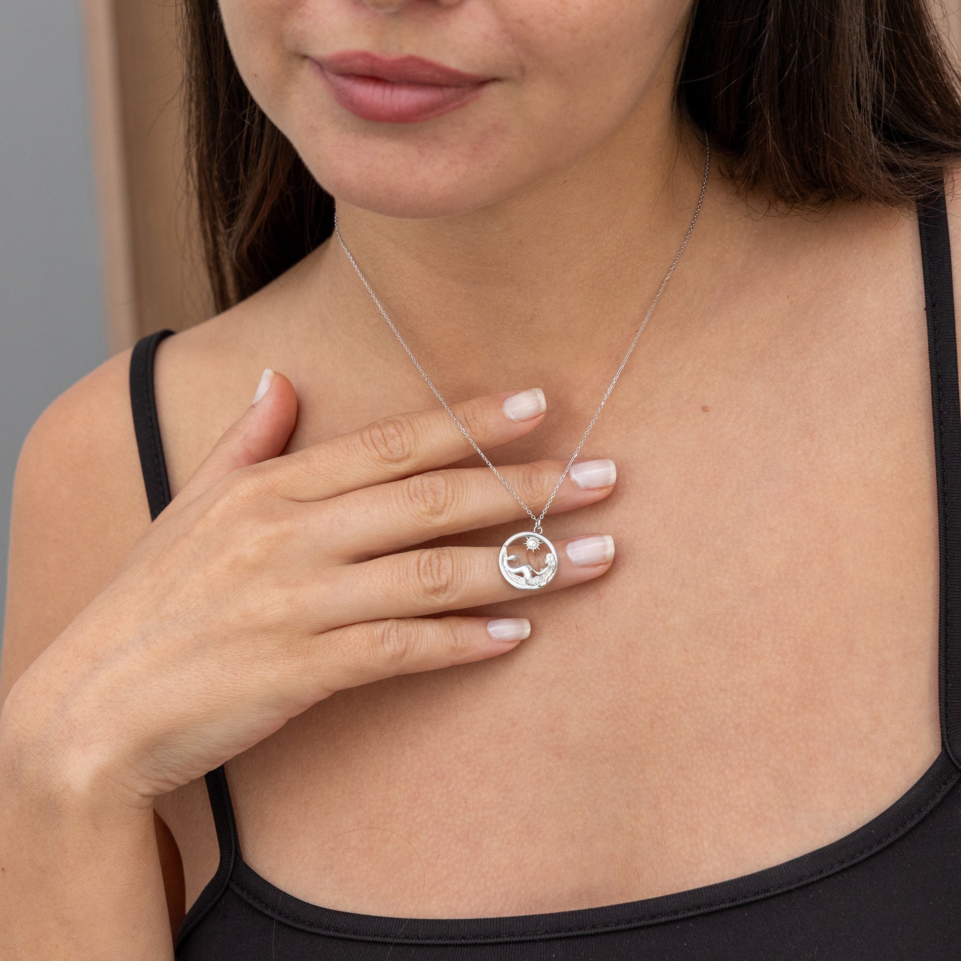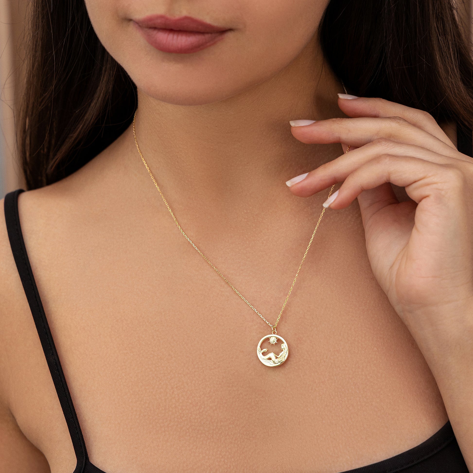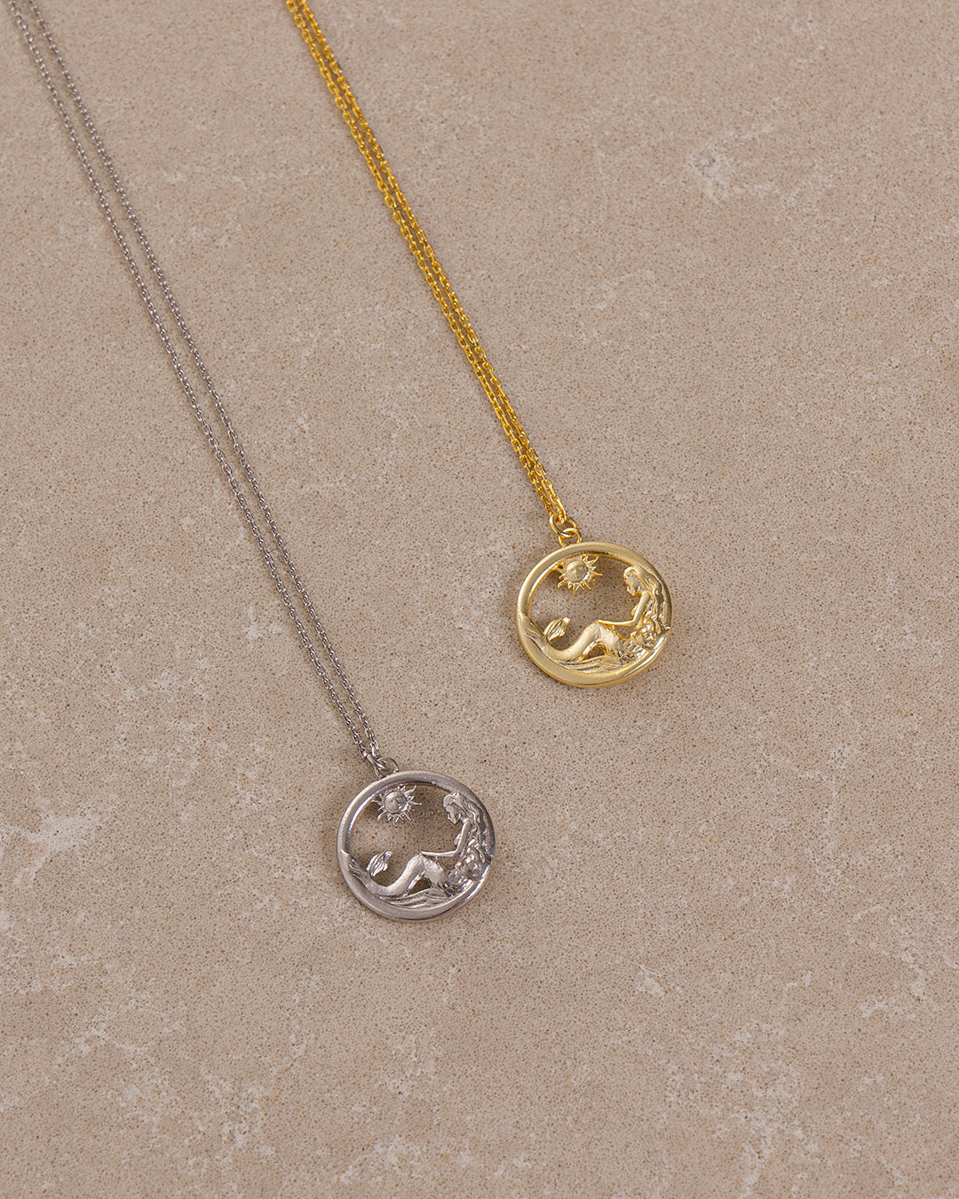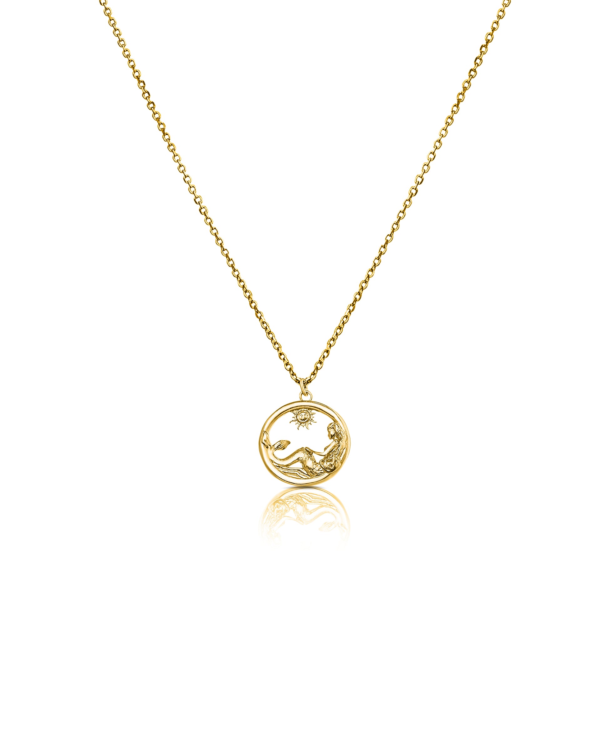 Bu denizkızı figürlü kolye, 925 ayar gümüşten üretilmiş olup altın kaplama ve rodajlı gümüş renk seçenekleriyle sunulur. Yuvarlak çerçeve içindeki denizkızı, güneş ve dalga detaylarıyla tasarım tamamlanmıştır.
