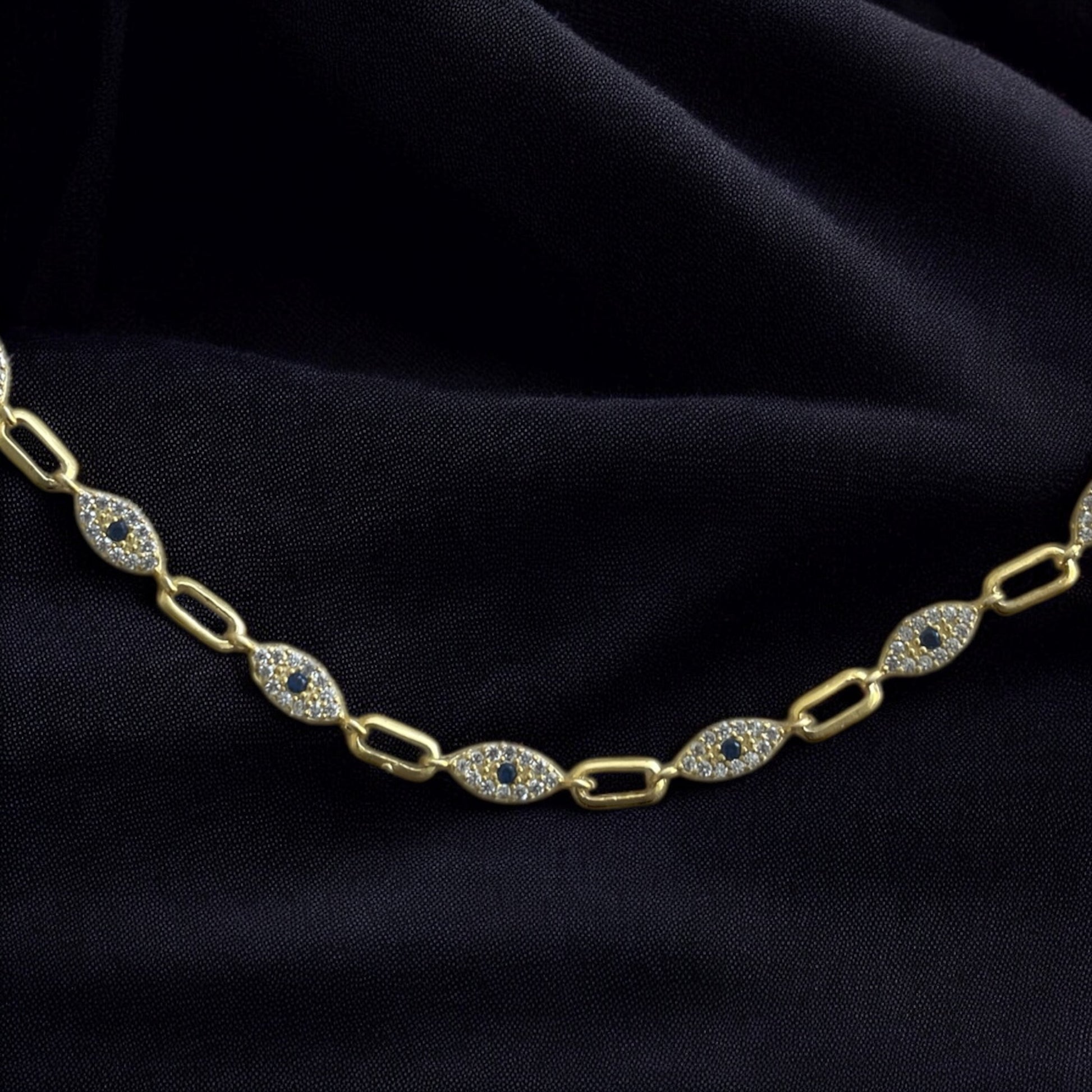🔹 Detay: Parlak zirkon taşlarla süslenmiş nazar boncuğu motifleri